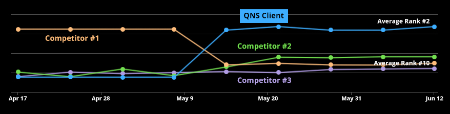 The chart above shows actual ranking results from a QNS client. We started working with this company in the beginning of May, 2017 and saw immediate, significant results. Not only did their ranking increase but the rankings of their major competitor fell.